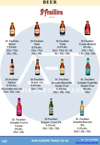 www.asiaeuropetrade.bizTel : +32 4 2535989www.asiaeuropetrade.bizASIA EUROPE TRADE CO SABEERSt.FeuillienBlond 7.5%Alc.33cl /75cl 20L /30LSt.FeuillienDark8.5%Alc.33cl /75cl 20L /30LSt.FeuillienTriple 8.5%Alc.33cl / 75cl/ 3L /6L9L / 20L /30LSt.FeuillienCuvee deNoel 9%Alc.33cl / 75cl 1.5L / 20L /30LSt.FeuillienSaison 6.5%Alc.33cl bottle andcan 75cl / 20L /30LSt.FeuillienGrandCru9.5%Alc.33cl/75clSt. FeuillienGrisette BlondBio GlutenFree5.5%Alc.25cl / 20L /30LSt. FeuillienGrisette TripleBio GlutenFree8%Alc.25clSt. FeuillienGrisette Fruitof Forest0%Alc.25cl /20LSt.FeuillienBelgian CoastIPA 5.5%Alc.33cl / 20L /30LSt. FeuillienGrisetteBlanche Bio5.5%Alc.25cl / 20L /30L160