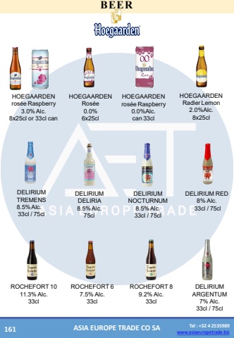 www.asiaeuropetrade.bizTel : +32 4 2535989www.asiaeuropetrade.bizASIA EUROPE TRADE CO SABEERHOEGAARDENros%u00e9eRaspberry 3.0%Alc.8x25clor 33cl canHOEGAARDENros%u00e9eRaspberry 0.0%Alc.can33clHOEGAARDENRadlerLemon 2.0%Alc.8x25clHOEGAARDENRos%u00e9e 0.0%6x25clROCHEFORT10ROCHEFORT6ROCHEFORT8DELIRIUM11.3%Alc.7.5%Alc.9.2%Alc.ARGENTUM33cl33cl33cl7%Alc.33cl /75clDELIRIUM DELIRIA 8.5%Alc.75clDELIRIUM NOCTURNUM 8.5%Alc.33cl /75clDELIRIUMRED8% Alc. 33cl /75clDELIRIUMTREMENS8.5%Alc.33cl/75cl161