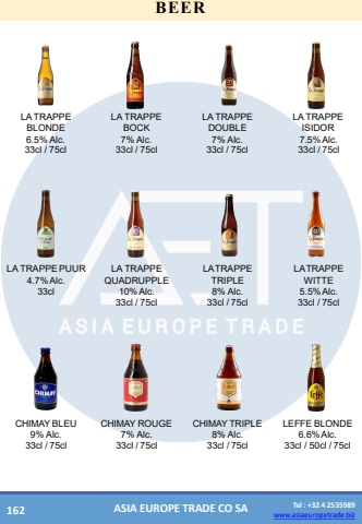Tel : +32 4 2535989www.asiaeuropetrade.bizASIA EUROPE TRADE CO SABEERLATRAPPEBLONDELATRAPPEBOCKLATRAPPEDOUBLELATRAPPEISIDOR6.5%Alc.7%Alc.7%Alc.7.5%Alc.33cl /75cl33cl /75cl33cl /75cl33cl /75clLA TRAPPEPUUR 4.7%Alc.33clLA TRAPPE QUADRUPPLE 10%Alc.33cl /75clLATRAPPE TRIPLE8% Alc. 33cl /75clLATRAPPE WITTE 5.5%Alc.33cl /75clCHIMAYBLEU9% Alc. 33cl /75clCHIMAYROUGE7% Alc. 33cl /75clCHIMAYTRIPLE8% Alc. 33cl /75clLEFFEBLONDE 6.6%Alc.33cl / 50cl /75cl162