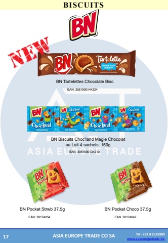 www.asiaeuropetrade.bizTel : +32 4 2535989www.asiaeuropetrade.bizASIA EUROPE TRADE CO SABISCUITSBN TartelettesChocolateBiscEAN: 3061990144324 BN Biscuits Choc'landMagie Chocolat au Lait 4 sachets. 150gEAN: 3061990134219 BN Pocket Strwb37.5gEAN: 30174054 BN Pocket Choco 37.5gEAN: 30174047 17