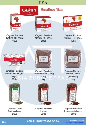 www.asiaeuropetrade.bizTel : +32 4 2535989www.asiaeuropetrade.bizASIA EUROPE TRADE CO SATEAOrganicRooibos Natural (80 bags)200gOrganicRooibos Natural (40 bags)100gOrganicRooibos & HoneybushLoose 200gOrganicRooibos Loose 200gOrganicGreen Rooibos Loose 200gOrganicRooibos Natural Loose (Long Cut)1kgOrganicRooibos Natural Loose (Stokkies) 1kgOrganicRooibos Natural Pouch(80 bags)200gRooibos TeaOrganicRooibos Natural (160 bags)400g195