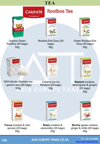 www.asiaeuropetrade.bizTel : +32 4 2535989www.asiaeuropetrade.bizASIA EUROPE TRADE CO SATEARooibos Earl Grey (20 bags)50gOrganicGreen Rooibos (20 bags)50gRevive(green rooibos, ginger& chilli) (20 bags)40gRelax(rooibos & camomille) (20 bags)50gFocus(rooibos & chai spices) (20 bags)50gCreamyVanillaRooibos (20 bags)50gRestore(rooibos, lemongrass & ginger) (20 bags) 50g100% BuchuRooibos tea%u2013genericbox (40 bags)100gRooibos TeaGreen Rooibos Earl Grey (20 bags)50g196