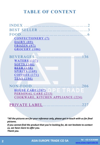 www.asiaeuropetrade.bizTel : +32 4 2535989www.asiaeuropetrade.bizASIA EUROPE TRADE CO SA2INDEX.%u2026%u2026%u2026%u2026%u2026%u2026%u2026%u2026%u2026%u2026%u2026%u2026.%u2026%u2026%u20262BESTSELLER.%u2026%u2026%u2026%u2026%u2026%u2026..%u2026%u2026%u2026%u2026%u20263FOOD%u2026%u2026%u2026%u2026%u2026%u2026%u2026%u2026%u2026%u2026%u2026%u2026%u2026%u2026.%u2026%u20266C O N F E C T I O NE RY ( 7 )D A I R Y ( 8 9 )F R O Z E N (9 7)G R O C E R Y ( 1 0 6 )BEVERAGES%u2026%u2026%u2026%u2026%u2026%u2026%u2026%u2026%u2026%u2026%u2026.. 136WA T E R S ( 1 3 7 )S O F T S ( 1 4 6 )B E E R ( 1 5 8 )S P I R I T S ( 1 6 9 )C O F F E E S ( 1 7 1 )T E A S ( 1 9 4 )NON-FOOD%u2026%u2026%u2026%u2026%u2026%u2026%u2026%u2026%u2026%u2026%u2026%u2026. 206H O U S E C A R E ( 2 0 7 )P E R S O N A L C A R E ( 2 1 3 )C O O K WA R E , K I T C H E N A P P L I A N C E (2 24)PRIVATE LABEL%u2026%u2026%u2026%u2026%u2026%u2026%u2026%u2026%u2026..227TABLE OF CONTENT*All the pictures are for your reference only, please get in touch with us for final pictures. If you cannot find the product that you%u2019re looking for, do not hesitate to contact us, we have more to offer you.Thank you. 2
