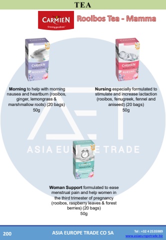 www.asiaeuropetrade.bizTel : +32 4 2535989www.asiaeuropetrade.bizASIA EUROPE TRADE CO SATEAMorningto help withmorningnauseaand heartburn(rooibos, ginger, lemongrass & marshmallow roots) (20 bags)50gNursing especiallyformulatedto stimulateand increaselactaction(rooibos, fenugreek, fenneland aniseed) (20 bags)50gRooibos Tea -MammaWomanSupport formulatedto easemenstrualpain and help womenin the thirdtrimesterof pregnancy(rooibos, raspberryleaves& forestberries) (20 bags)50g200