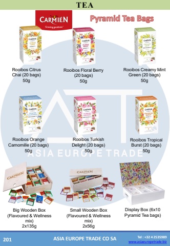 www.asiaeuropetrade.bizTel : +32 4 2535989www.asiaeuropetrade.bizASIA EUROPE TRADE CO SATEARooibos Floral Berry (20 bags)50gRooibos Citrus Chai (20 bags)50gBig WoodenBox (Flavoured& Wellnessmix)2x135gRooibos Turkish Delight(20 bags)50gRooibos Tropical Burst(20 bags) 50gRooibos Orange Camomille (20 bags)50gPyramidTea BagsRooibos CreamyMint Green (20 bags)50gSmall WoodenBox (Flavoured& Wellnessmix)2x56gDisplay Box (6x10 PyramidTea bags)201