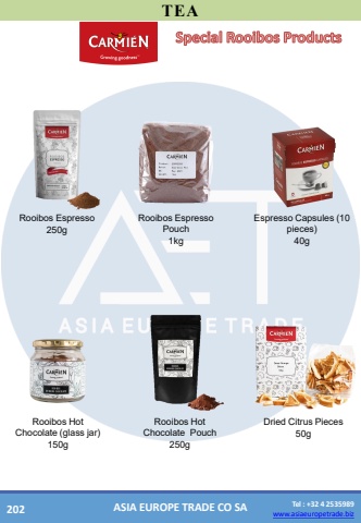 www.asiaeuropetrade.bizTel : +32 4 2535989www.asiaeuropetrade.bizASIA EUROPE TRADE CO SATEARooibos Espresso Pouch1kgRooibos Espresso250gEspresso Capsules (10 pieces)40gRooibos Hot ChocolatePouch250gSpecialRooibos ProductsRooibos Hot Chocolate(glass jar)150gDriedCitrus Pieces50g202