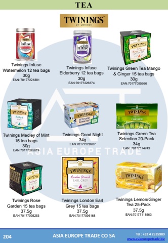 www.asiaeuropetrade.bizTel : +32 4 2535989www.asiaeuropetrade.bizASIA EUROPE TRADE CO SATEATwiningsInfuse Watermelon12 teabags30gEAN: 70177226381TwiningsInfuse Elderberry 12 tea bags30gEAN:70177226374TwiningsGreen Tea Mango & Ginger 15 teabags30gEAN:70177095666TwiningsMedley of Mint 15 tea bags30gEAN:70177095819Twinings Good Night34gEAN:70177229207Twinings Green Tea Selection 20-Pack34gEAN: 70177174743TwiningsRose Garden 15 tea bags37.5gEAN:70177095253TwiningsLondon Earl Grey 15 tea bags37.5gEAN:70177096168TwiningsLemon/Ginger Tea 25-Pack37.5gEAN:70177118563204