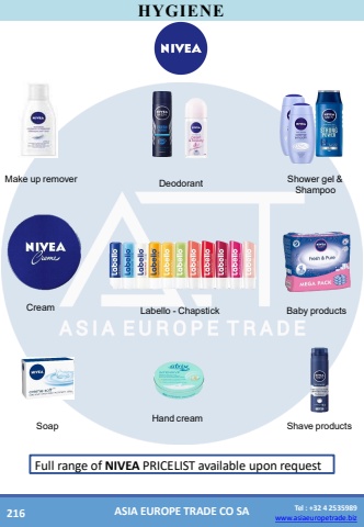 www.asiaeuropetrade.bizTel : +32 4 2535989www.asiaeuropetrade.bizASIA EUROPE TRADE CO SAHYGIENEMake upremoverDeodorantCreamShower gel& ShampooSoapLabello -ChapstickBabyproductsShaveproductsHandcreamFullrangeof NIVEAPRICELIST available uponrequest216