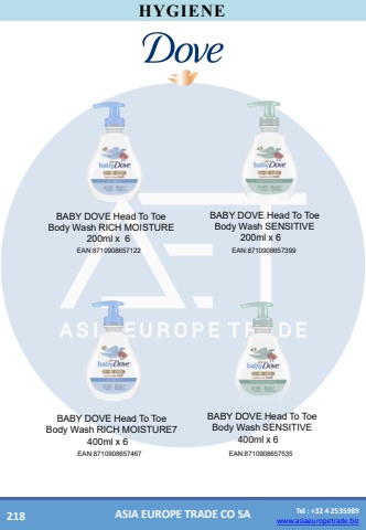 www.asiaeuropetrade.bizTel : +32 4 2535989www.asiaeuropetrade.bizASIA EUROPE TRADE CO SAHYGIENEBABY DOVE Head To Toe Body Wash RICH MOISTURE 200ml x 6EAN:8710908657122 BABY DOVE Head To Toe Body Wash SENSITIVE200ml x 6EAN:8710908657399 BABY DOVE Head To Toe Body Wash RICH MOISTURE7400ml x 6EAN:8710908657467 BABY DOVE Head To Toe Body Wash SENSITIVE400ml x 6EAN:8710908657535218