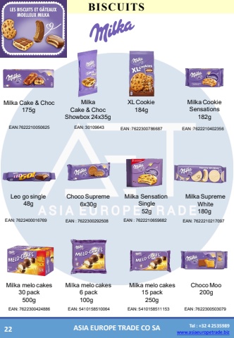 www.asiaeuropetrade.bizTel : +32 4 2535989www.asiaeuropetrade.bizASIA EUROPE TRADE CO SABISCUITSEAN:7622300786687EAN:7622210402356EAN:7622300503079EAN :7622300292508EAN:7622210217097EAN:7622210050625XLCookie 184gMilkaCookie Sensations 182gChocoMoo 200gChocoSupreme 6x30gMilkaSupreme White 180gMilka Cake &Choc 175gMilka Cake &ChocShowbox24x35gEAN:30109643EAN:7622400016769Leo gosingle 48gEAN :7622210659682Milka Sensation Single52gEAN:7622300424886EAN:5410158510064EAN:5410158511153Milka melocakes 6 pack 100gMilka melocakes 15pack250gMilka melocakes 30pack500g22