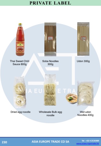 www.asiaeuropetrade.bizTel : +32 4 2535989www.asiaeuropetrade.bizASIA EUROPE TRADE CO SAPRIVATELABELThai Sweet ChilliSauce 800gDriedegg noodleWholesaleBulk eggnoodleUdon300gWetudonNoodles400gSoba Noodles300g 230