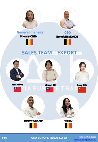 www.asiaeuropetrade.bizTel : +32 4 2535989www.asiaeuropetrade.bizASIA EUROPE TRADE CO SAShenny CHENBenoit LISMONDESALES TEAM %u2013EXPORTKen HUNGMomo SUAmy SUNSammy ABDI ALIN 233Hsia HOGeneral managerCEO