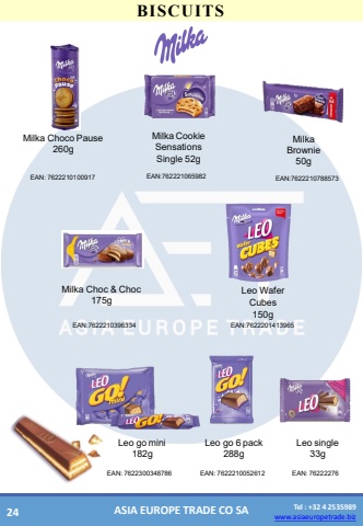 www.asiaeuropetrade.bizTel : +32 4 2535989www.asiaeuropetrade.bizASIA EUROPE TRADE CO SABISCUITSEAN:7622210100917EAN:762221065982EAN:7622210788573EAN:7622300348786EAN:7622210052612EAN:76222276Milka Brownie 50gLeo go 6pack288gLeo gomini 182gLeosingle 33gMilkaCookie Sensations Single52gMilka ChocoPause 260gEAN:7622210396334Milka Choc &Choc 175gEAN:7622201413965Leo Wafer Cubes 150g24