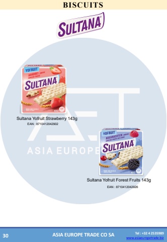 www.asiaeuropetrade.bizTel : +32 4 2535989www.asiaeuropetrade.bizASIA EUROPE TRADE CO SABISCUITSSultana YofruitStrawberry143g EAN : 8710412042902 Sultana YofruitForest Fruits 143g EAN : 8710412042926 30