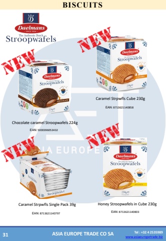www.asiaeuropetrade.bizTel : +32 4 2535989www.asiaeuropetrade.bizASIA EUROPE TRADE CO SABISCUITSEAN:8713621140858Caramel StrpwflsCube 230gEAN:5000396053432Chocolatecaramel Stroopwafels224gEAN:8713621140803Honey Stroopwafelsin Cube 230gEAN:8713621140797Caramel StrpwflsSingle Pack 39g31