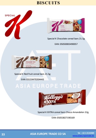 www.asiaeuropetrade.bizTel : +32 4 2535989www.asiaeuropetrade.biz33ASIA EUROPE TRADE CO SAEAN:05050083490057Special K Chocolate cerealbars 21.5gEAN:03159470204443SpecialK Red fruit cerealbars 21.5gEAN:05053827190169Special K EXTRA cerealbars Choco Amandelen 32gBISCUITS
