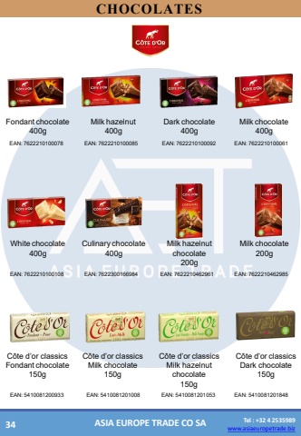 www.asiaeuropetrade.bizTel : +32 4 2535989www.asiaeuropetrade.bizASIA EUROPE TRADE CO SACHOCOLATESEAN:7622210100078EAN:7622210100085EAN:7622210100092EAN:7622210100061EAN:7622210100108EAN:7622300166984EAN:7622210462961EAN:7622210462985EAN:5410081200933EAN:5410081201008EAN:5410081201053EAN:5410081201848Fondantchocolate 400gMilkhazelnut 400gDarkchocolate 400gMilkchocolate 400gWhitechocolate 400gCulinarychocolate 400gMilkhazelnut chocolate 200gMilkchocolate 200gC%u00f4te d%u2019or classics Fondantchocolate 150gC%u00f4te d%u2019orclassics Milk chocolate 150gC%u00f4te d%u2019orclassics Milk hazelnut chocolate150gC%u00f4te d%u2019orclassics Dark chocolate 150g34