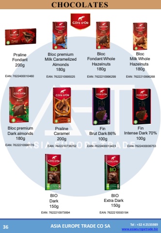 www.asiaeuropetrade.bizTel : +32 4 2535989www.asiaeuropetrade.bizASIA EUROPE TRADE CO SACHOCOLATESEAN:7622400010460EAN:7622210996176EAN:7622210995025EAN:7622210738752EAN:7622400013423EAN:7622400006753Praline Fondant 200gBlocFondantWhole Hazelnuts 180gEAN:7622210996299Bloc MilkWhole Hazelnuts180gEAN:7622210996268Blocpremium Darkalmonds 180gBloc premium MilkCaramelized Almonds180gFin Intense Dark70%100gPraline Caramel200gFinBrut Dark86% 100gEAN:7622210973894BIODark150gEAN:7622210593184BIO Extra Dark150g36