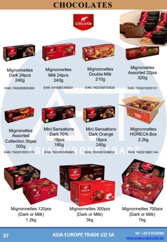 www.asiaeuropetrade.bizTel : +32 4 2535989www.asiaeuropetrade.bizASIA EUROPE TRADE CO SACHOCOLATESEAN:7622201009625EAN:7622201009632EAN:7622200002290EAN:5410081206201EAN:7622300733520MignonnettesDark 24pcs 240gMignonnettesMilk 24pcs 240gMignonnettesDoubleMilk 210gMignonnettes120pcs(Darkor Milk)1.2kgMiniSensations Dark70%18pcs180gMiniSensations Dark Orange 18pcs240gEAN:7622210333131EAN:7622210333179Mignonettes Assorted 32pcs320gMignonettes Assorted Collection 30pcs300gEAN:7622210881144MignonnettesHORECA Box2.2kgMignonnettes300pcs(Darkor Milk)3kgMignonnettes700pcs(Darkor Milk)7kg37