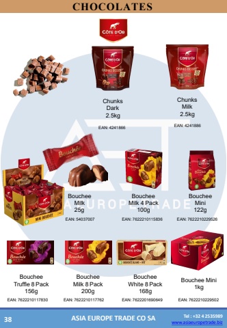 www.asiaeuropetrade.bizTel : +32 4 2535989www.asiaeuropetrade.bizASIA EUROPE TRADE CO SACHOCOLATESEAN:4241866EAN:4241886EAN:54037007EAN:7622210115836EAN:7622210229526EAN:7622210117830EAN:7622210117762EAN:7622201690649EAN:7622210229502Bouchee Milk 25gBouchee Milk 4Pack 100gBouchee Mini 122gBouchee Truffle 8Pack 156gBouchee Milk 8Pack 200gBouchee White 8Pack 168gBouchee Mini 1kgChunksDark2.5kgChunksMilk2.5kg38