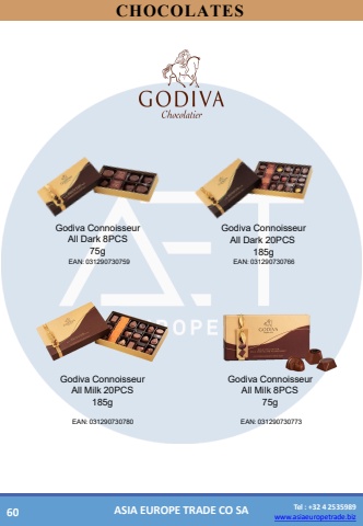www.asiaeuropetrade.bizTel : +32 4 2535989www.asiaeuropetrade.bizASIA EUROPE TRADE CO SACHOCOLATESEAN:031290730759EAN:031290730773Godiva ConnoisseurAll Dark8PCS75gGodiva ConnoisseurAll Milk 8PCS75gGodiva ConnoisseurAll Dark20PCS185gEAN:031290730766Godiva ConnoisseurAll Milk 20PCS185gEAN:03129073078060