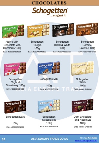 www.asiaeuropetrade.bizTel : +32 4 2535989www.asiaeuropetrade.bizASIA EUROPE TRADE CO SACHOCOLATESAlpine Milk ChocolatewithHazelnuts100gEAN:4000607851001SchogettenCaramel Brownie 100gEAN:4000415040109SchogettenWhite100gEAN:4000415856601SchogettenMilk100gEAN:4000607850004SchogettenYoghurtStrawberry100gEAN:4000607854705DarkChocolateand Hazelnuts100gEAN:4000415730109SchogettenStracciatella100gEAN:4000415111908SchogettenDark100gEAN:4000607852008SchogettenTrilogia100gEAN:4000415143800SchogettenBlack & White 100gEAN:400041503970762