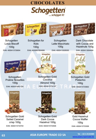 www.asiaeuropetrade.bizTel : +32 4 2535989www.asiaeuropetrade.bizASIA EUROPE TRADE CO SACHOCOLATESSchogettenLotus Biscoff100gEAN:4000415729004DarkChocolatewithCocoa and Hazelnuts100gEAN:4000415004408SchogettenGold Pistachio100gEAN:4000415733902SchogettenGold CoconutAlmond100gEAN:4000415734107SchogettenPraline Noisettes 100gEAN:4000415851705Gold HazelnutCocoa Waffer100gEAN:4000415733308SchogettenGold DarkCocoa Hazelnut100gEAN:4000415733506SchogettenGold SaltedCaramel crisp100gEAN:4000415733704Schogettenfor Kids 100gEAN:4000607854606SchogettenLatte Macchiato 100gEAN:400041502830563