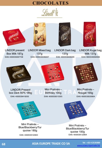 www.asiaeuropetrade.bizTel : +32 4 2535989www.asiaeuropetrade.bizASIA EUROPE TRADE CO SACHOCOLATESLINDORpresentBox Milk187gEAN:4000539387708LINDOR Mixedbag137gEAN:4000539389207LINDOR KugelbagMilk137gEAN:8003340094069LINDOR Darkbag137gEAN:4000539408205LINDOR Present box Dark 60%186gEAN:4000539416200MiniPralin%u00e9s%u2013Birthday100gEAN:4000539315305Mini Pralin%u00e9s%u2013Blue/Blackberry/Tur quoise100gEAN:4000539122804MiniPralin%u00e9s%u2013Nougat165gEAN:4000539320804Mini Pralin%u00e9s%u2013Blue/Blackberry/Tur quoise180gEAN:400053912290368