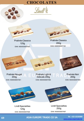 www.asiaeuropetrade.bizTel : +32 4 2535989www.asiaeuropetrade.bizASIA EUROPE TRADE CO SACHOCOLATESPralin%u00e9sNougat 200gEAN:4000539307201Pralin%u00e9sLight& Delicate200gEAN:4000539307300Pralin%u00e9sNoir 200gEAN:4000539307409LindtSpecialties 125gEAN:4000539307508LindtSpecialties 250gEAN:4000539307607Pralin%u00e9sClassics 125gEAN:4000539307003Pralin%u00e9sClassics 200gEAN:400053930710269