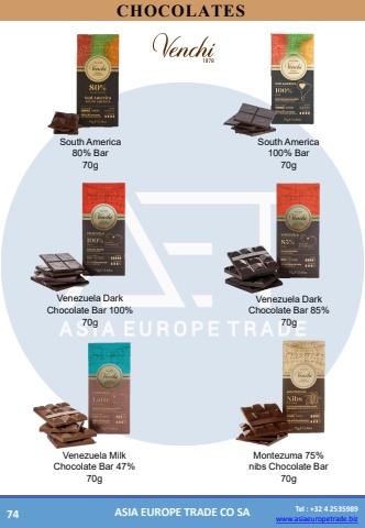 www.asiaeuropetrade.bizTel : +32 4 2535989www.asiaeuropetrade.bizASIA EUROPE TRADE CO SACHOCOLATESSouth America 80% Bar70gSouth America 100% Bar70gVenezuela DarkChocolateBar 100%70gVenezuela DarkChocolateBar 85%70gVenezuela Milk ChocolateBar 47%70gMontezuma 75% nibsChocolateBar70g74