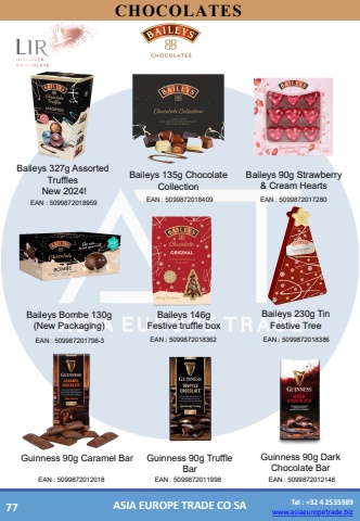 www.asiaeuropetrade.bizTel : +32 4 2535989www.asiaeuropetrade.bizASIA EUROPE TRADE CO SACHOCOLATESBaileys 327g Assorted TrufflesNew 2024!EAN : 5099872018959Baileys 135g ChocolateCollectionEAN : 5099872018409Baileys 90g Strawberry & Cream HeartsEAN : 5099872017280Baileys Bombe 130g (New Packaging)EAN : 509987201798-3Baileys 146g Festive truffle boxEAN : 5099872018362Baileys 230g Tin Festive TreeEAN : 5099872018386Guinness 90g Caramel Bar EAN : 5099872012018Guinness 90g Truffle BarEAN : 5099872011998Guinness 90g DarkChocolateBarEAN : 509987201214877