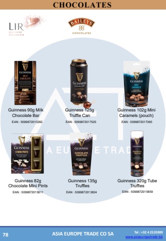 www.asiaeuropetrade.bizTel : +32 4 2535989www.asiaeuropetrade.bizASIA EUROPE TRADE CO SACHOCOLATESGuinness 90g Milk Chocolate BarEAN : 5099872013282Guinness 125g Truffle CanEAN : 5099872017525Guinness 102g Mini Caramels (pouch)EAN : 5099872017365 Guinness 82g Chocolate MIni PintsEAN : 5099872015811Guinness 135g TrufflesEAN : 5099872013824 Guinness 320g Tube TrufflesEAN : 509987201585978