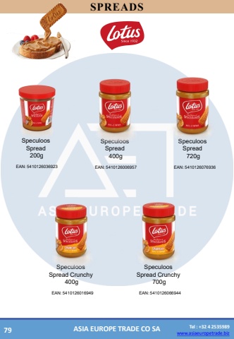 www.asiaeuropetrade.bizTel : +32 4 2535989www.asiaeuropetrade.bizASIA EUROPE TRADE CO SASPREADSSpeculoosSpread200gEAN:5410126036923SpeculoosSpread400gEAN:5410126006957SpeculoosSpread720gEAN:5410126076936SpeculoosSpread Crunchy400gEAN:5410126016949SpeculoosSpread Crunchy700gEAN:541012606694479
