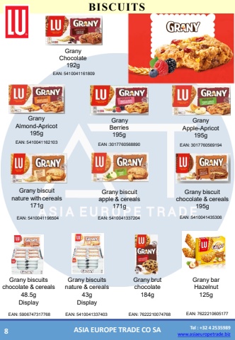 www.asiaeuropetrade.bizTel : +32 4 2535989www.asiaeuropetrade.bizASIA EUROPE TRADE CO SABISCUITSEAN:5410041162103EAN:3017760569194EAN:5410041161809EAN:3017760568890EAN:5410041196504EAN:5410041337204EAN:5410041435306GranyAlmond-Apricot 195gGranyApple-Apricot 195gGranyChocolate 192gGrany Berries 195gGrany biscuit nature withcereals 171gGrany biscuit apple&cereals 171gGrany biscuit chocolate &cereals 195gEAN:5906747317768EAN:5410041337403EAN:7622210074768Grany biscuits chocolate &cereals 48.5gDisplayGrany biscuits nature &cereals 43gDisplayGranybrut chocolate 184gGrany bar Hazelnut125gEAN:76222106051778