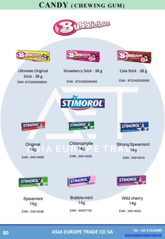www.asiaeuropetrade.bizTel : +32 4 2535989www.asiaeuropetrade.bizASIA EUROPE TRADE CO SACANDY ( CHEWINGGUM)EAN :54014008EAN :54014039EAN :54014015EAN :54014046EAN :54037182EAN :54014022Original 14gChlorophylle14gStrongSpearmint 14gWildcherry 14gSpearmint 14gBubblemint 14gEAN :8723400939504UltimateOriginalStick -38 gEAN :8723400940463StrawberryStick -38 gEAN :8723400939580Cola Stick -38 g80