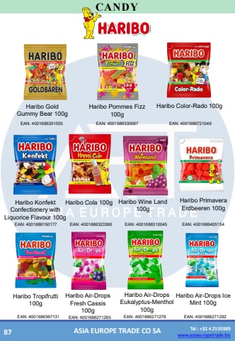www.asiaeuropetrade.bizTel : +32 4 2535989www.asiaeuropetrade.bizASIA EUROPE TRADE CO SACANDYHaribo Gold Gummy Bear 100gEAN: 4001686301555 Haribo Pommes Fizz100gEAN: 4001686330067Haribo KonfektConfectionery with LiquoriceFlavour100gEAN: 4001686150177Haribo Cola 100gEAN: 4001686323366Haribo Tropifrutti100gEAN: 4001686367131 Haribo PrimaveraErdbeeren100g EAN: 4001686405154 Haribo Color-Rado100gEAN: 4001686721049Haribo Air-Drops Eukalyptus-Menthol 100gEAN: 4001686271278 Haribo Air-Drops Ice Mint 100gEAN: 4001686271292 Haribo Air-Drops Fresh Cassis 100gEAN: 4001686271285Haribo WineLand 100gEAN: 400168631004587
