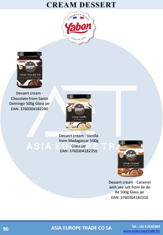 www.asiaeuropetrade.bizTel : +32 4 2535989www.asiaeuropetrade.bizASIA EUROPE TRADE CO SACREAM DESSERT Dessert cream -Chocolate from Santo Domingo 500g Glass jarEAN: 3760304182280Dessert cream -Vanilla from Madagascar 500g Glass jarEAN: 3760304182259Dessert cream -Caramelwith sea salt from Ile de R%u00e9500g Glass jarEAN: 376030418231096