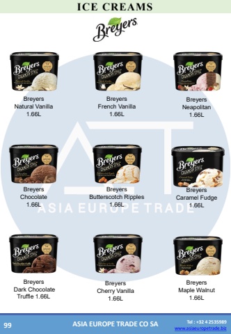www.asiaeuropetrade.bizTel : +32 4 2535989www.asiaeuropetrade.bizASIA EUROPE TRADE CO SAICECREAMSBreyersDarkChocolateTruffle 1.66LBreyersNatural Vanilla1.66LBreyersButterscotchRipples1.66LBreyersNeapolitan1.66LBreyersFrench Vanilla1.66LBreyersMaple Walnut1.66LBreyersCherry Vanilla1.66LBreyersCaramel Fudge1.66LBreyersChocolate1.66L99