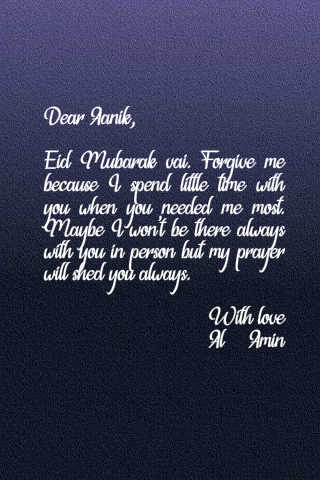 Dear Aanik, Eid Mubarak vai. Forgive me because I spend little time with you when you needed me most. Maybe I won't be there always with you in person but my prayer will shed you always. With love Al Amin