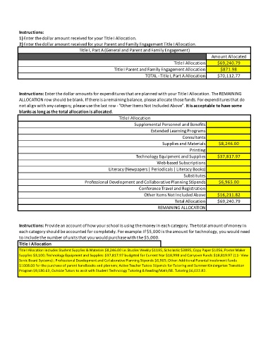 Instructions: Enter the dollar amounts for expenditures that are planned with your Title I Allocation. The REMAINING