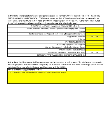 PARENT AND FAMILY ENGAGEMENT ALLOCATION row should be blank. If there is a remaining balance, please allocate