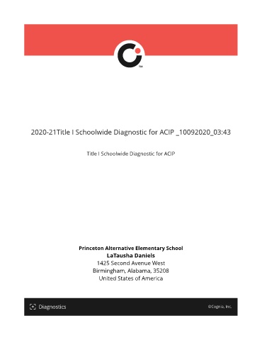 2020-21Title I Schoolwide Diagnostic for ACIP _10092020_03:43 Title I Schoolwide Diagnostic for ACIP Princeton Alternative Elementary School LaTausha Daniels 1425 Second Avenue West Birmingham, Alabama, 35208 United States of America ©Cognia, Inc.