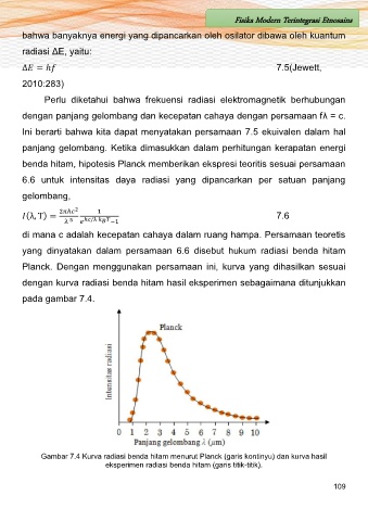 Gambar 7.4 Kurva radiasi benda hitam menurut Planck (garis kontinyu) dan kurva hasil