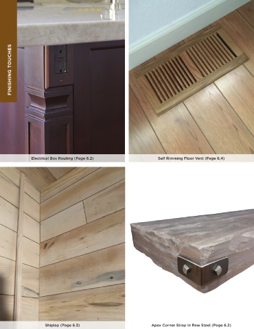 FINISHING TOUCHES BUN FEET Electrical Box Routing (Page 6.2) Self Rimming Floor Vent (Page 6.4) Shiplap (Page 6.3) Apex Corner Strap in Raw Steel (Page 6.2)