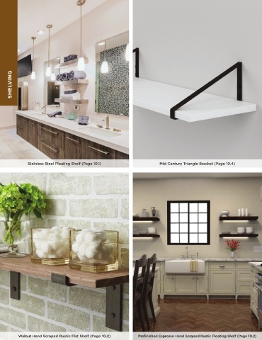 SHELVING Stainless Steel Floating Shelf (Page 10.1) Mid-Century Triangle Bracket (Page 10.4) Walnut Hand Scraped Rustic Flat Shelf (Page 10.2) Prefinished Espresso Hand Scraped Rustic Floating Shelf (Page 10.2)