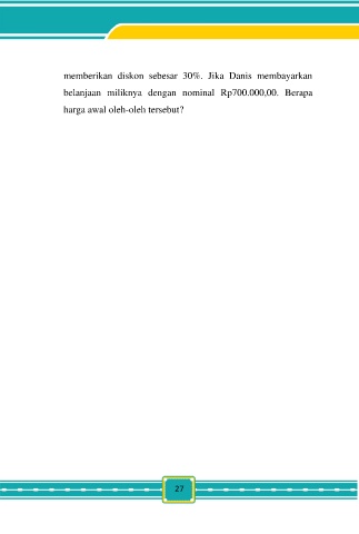 memberikan diskon sebesar 30%. Jika Danis membayarkan belanjaan miliknya dengan nominal Rp700.000,00. Berapa harga awal oleh-oleh tersebut? 27