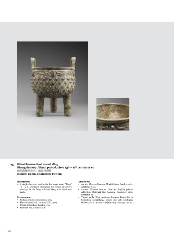 ▪ A single character cast inside the vessel reads “Ding” ▪ Ancient Chinese Bronzes, Bluett & Sons, London 1963, ▪ Bluett & Sons Ltd., Ancient Chinese Bronzes, London Collection, London 2009, p. 158, no. 72.