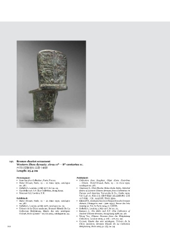 141. Bronze chariot ornament 142. Pair of taotie masks with ring handles