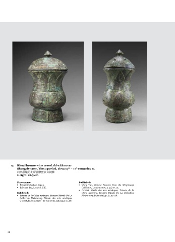 15. Ritual bronze wine vessel zhi with cover 16. Ritual bronze wine vessel zhi with cover