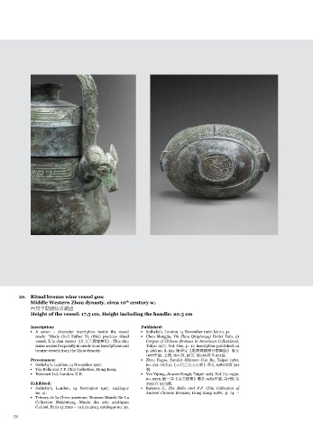 ▪ Sotheby’s, London, 14 November 1967, catalogue ▪ Rawson J., The Bella and P.P. Chiu Collection of ▪ Wu Zhenfeng, Shang Zhou Qingtongqi Mingwen